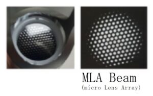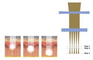 このハンドピースを用いると、多数の微小なレーザービームに分割して、真皮層が焦点となるように点状(フラクショナル)に照射することが出来ます。