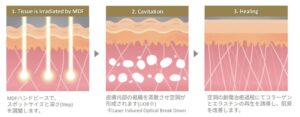 レーザーを点状(フラクショナル)に照射することで、照射部に急激な温度上昇が起こると衝撃波が生じ、真皮内に小さな空洞(LIOB:Laser Induced Optical Breakdown)が点状に多数形成されます。創傷治癒過程にて肌が再生する際に、コラーゲンとエラスチンの再生を誘導し、表皮・真皮のターンオーバーを促進し、肌質を改善します。